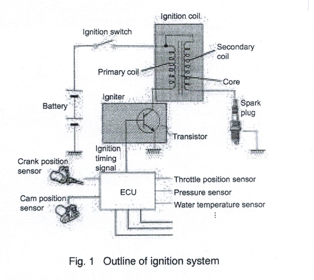點火裝置的概要如圖Fig.1示,為了使高度壓縮的混合氣體產生電火花,必須在火花塞的兩個電極之間加上高壓,通過點火線圈產生高壓,放電電壓通常在10kV~15kV,最大也有超過30kV的。電流有在數(shù)十mA,比起點火的時機會使引擎的輸出,發(fā)射都會發(fā)生變化,為了遵從各引擎條件最佳點火時機,對于點火線圈產生高壓的時間進行控制是非常必要的,通過對電流通斷的控制從而控制點火線圈產生高壓,以各種傳感器的信號為條件由ECU決定后執(zhí)行點火。